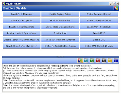 Windows 7 Quick Fix Tools solve 108 Common Problems in Windows 7 Operating System. Just download & fix the common errors (Enable -Task Manager / Registry / Command Prompt / Windows Folder Options & more..) 1.47MB only .